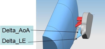 Two variables were studied - the Angle of Attack ('AoA' in the diagram below) is the angle between the car body and the delta. Leading Edge ('LE' below) is the point along the body where the delta joins.
