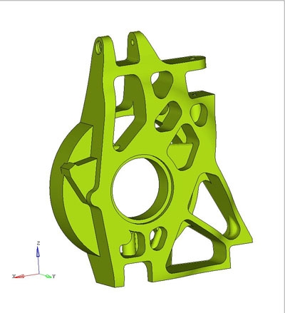 The result of running the optimiser on his computer is shown in the picture on the right. The material that doesn’t add anything to the performance of the component has been taken away, leaving some surprising holes that just could not have been predicted. The component is then worked on some more by the design team and further optimised and eventually turned into the final design for the component which is pictured at the top of the page.